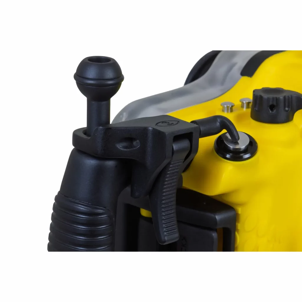 Our Side Fire Shutter Release also integrates beautifully with ball head mounts for lighting rigs. If you’re diving with strobes or video lights on articulated arms, you can build out a genuinely complete and professional dive setup with the housing as the foundation. Wide double-grip stance, trigger in reach, lights on ball heads. It’s the kind of rig that lets you descend onto a reef and just shoot, without constantly managing your equipment.